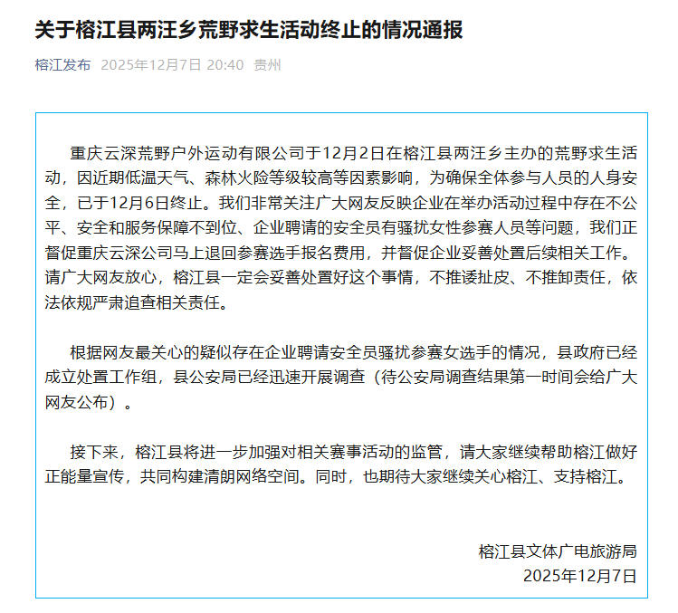贵州榕江荒野求生被曝安全员骚扰女选手,比赛已停止,多方回应